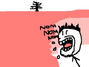 Inevitably, I'd end up getting lost, despite reaching the tree only necessitating travelling in a straight line for a considerable period of time. At the point I got lost, I'd rise up above the mousse-field and see how far I had to go, and the path I'd carved (eaten). It always twisted and turned inexplicably, and I was never anywhere near the tree. Then I'd wake up.