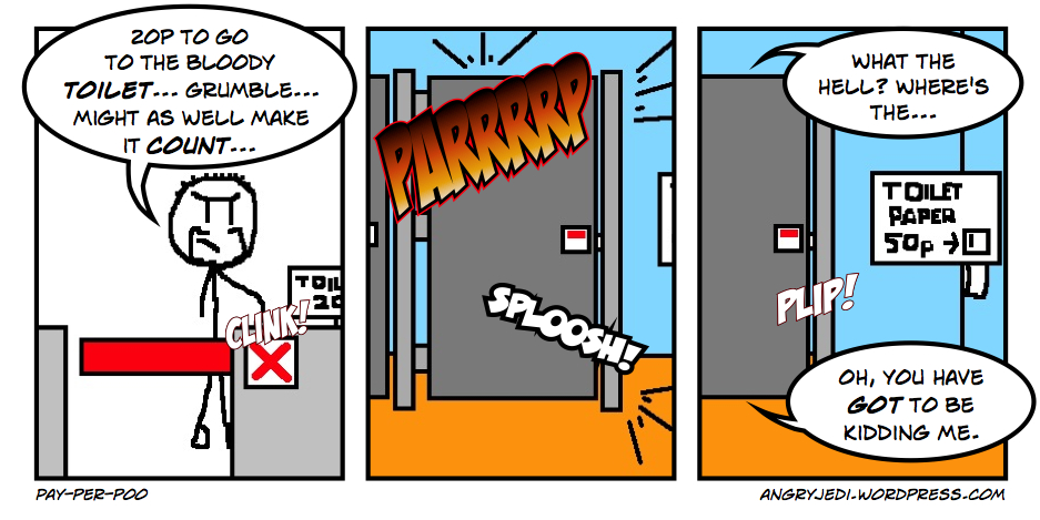 You may argue that the ability to have a piss is inherently more essential and therefore valuable than an eBook. But technically I can have a piss anywhere. The charge on the toilet is not stopping me from, say, pissing myself. The nice policeman standing on the corner might, however.