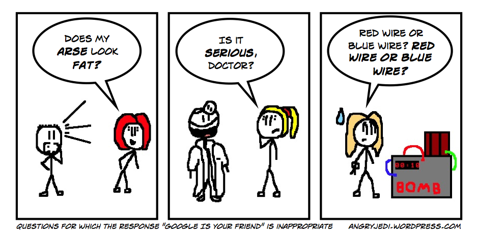 Ladies and gentlemen, we are afflicted with a plague of the Information Age. The plague of "Google/the search bar is your friend". A plague of laziness, if you will, as this is a catch-all response which makes it look like you're being vaguely helpful and/or knowledgeable when in fact all you're doing is being an arrogant asshole and trying to get out of answering a question as quickly as possible.