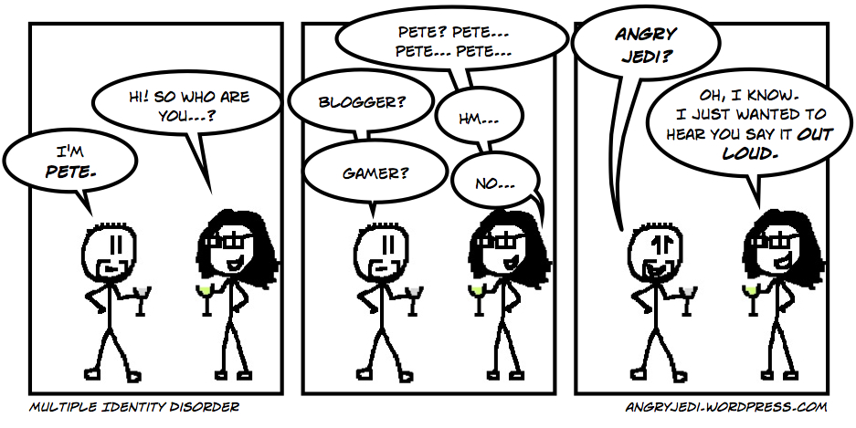 "Hello, I'm Pete," assumes that your conversational partner has paid attention to your profile (assuming you put your real name on it, which some people don't) and carries the risk of them looking at you blankly and going "Who?" while walking up to someone and cheerfully announcing that "I'm angryjedi!" could simply prompt a look of bewilderment, a cry of "No, I'm angryjedi!" to start echoing around the room or someone laughing in your face.