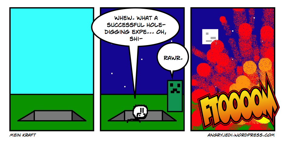 There's also an element of risk, though. Death isn't permanent—but it does cause you to drop all your stuff and potentially lose it. If you've spent a long time collecting things, this can be a real pain, especially if you were exploring a long way from your home spot. Then there's the fact that the game's most notorious enemies, the "Creepers", explode when they get near you. Not only does this cause significant damage to you, it also blows big holes in the things you've built.