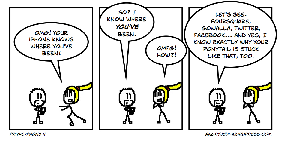 The main objection seems to be that the device is doing this without the user's knowledge. But I even can't see the problem with this, really. If you're going somewhere you shouldn't be or doing something/one you shouldn't be, then don't take an Internet-connected GPS-enabled device with you that — shock horror — might know where you are. And for fuck's sake, don't check in on Foursquare while you're at your bit on the side's house. It's always your choice. If you want to be part of the digital revolution, then you have to get used to the fact that your information is out there for as long as you're connected to the Internet.