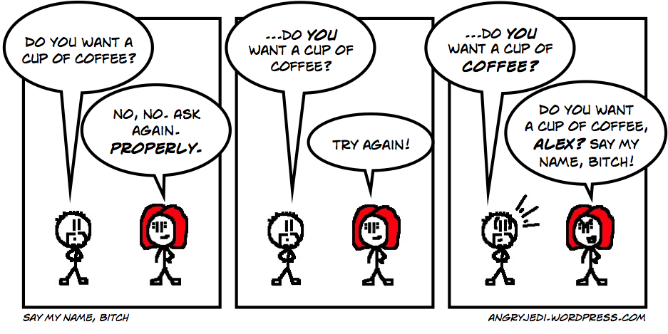 I don't mind people calling me by name, though, that's the weird thing. And I'm aware it's silly to feel odd about saying other people's names — particularly if you're calling out for someone. "Hey! You!" really doesn't cut it in a room full of people — although to be honest, I've never really been one for calling out anyway, as I generally much prefer to just go over to the person in question and speak to them, as yelling just draws attention to 1) you and 2) the person you're yelling at, who may not be grateful for the attention.
