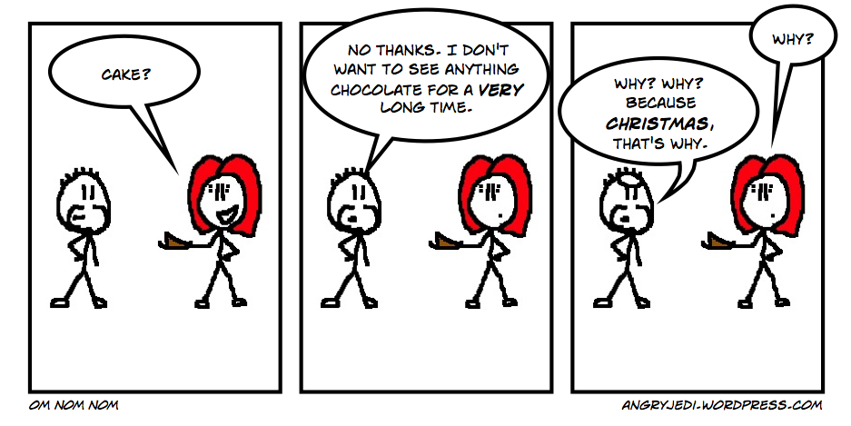 For me, it's a topic that plays into one of my very many neuroses. I hate being fat, but unfortunately I enjoy the taste of food about as much as I hate being fat. I loathe my own body, but find myself eating things when I get depressed or upset or just for the hell of it at times — a habit which hasn't exactly been helped by the enormous amounts of food we acquired over the Christmas break. If it's there, it gets eaten, and it's often hard to resist.