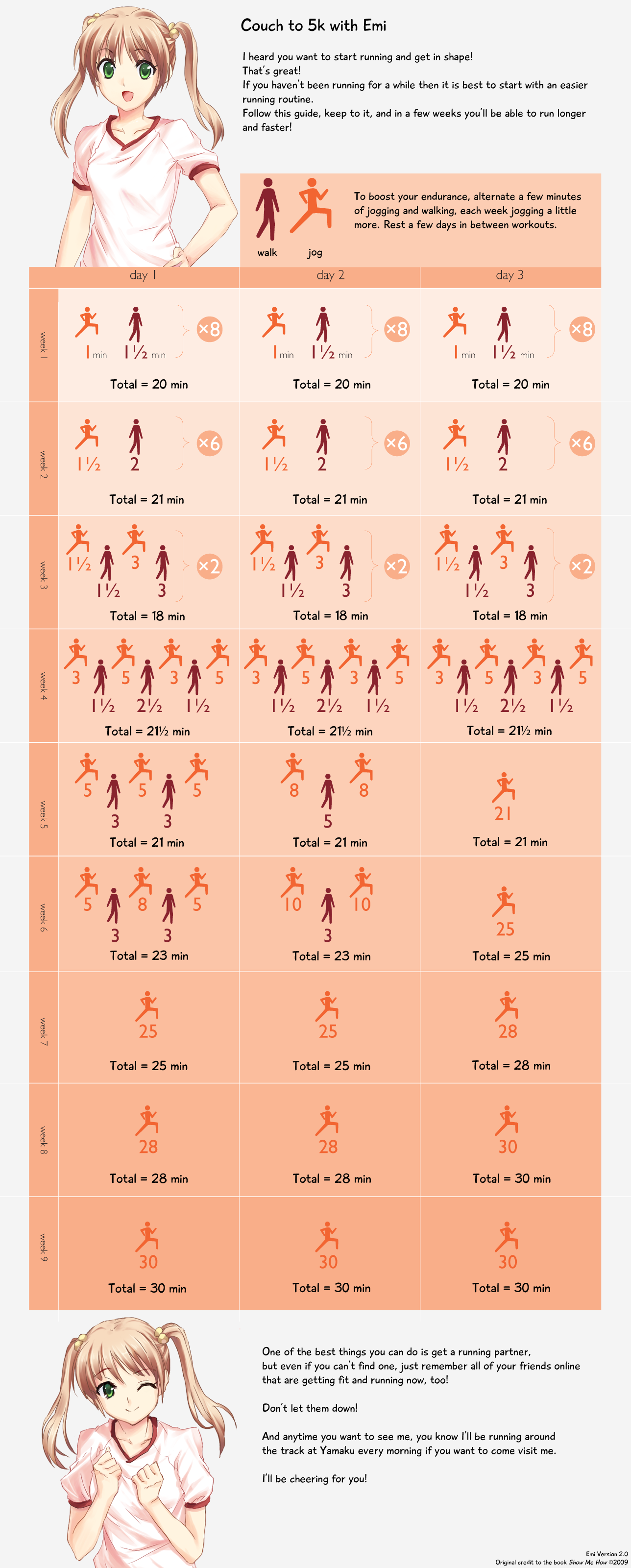 What would happen, then, if you combined the infectiously cheerful, never-give-up personality of Emi with the well-paced Couch to 5K programme? Well, you get the following chart, which I include here after the break as a courtesy to that certain subset of you who have played Katawa Shoujo and are considering taking up running but having absolutely no idea where to start. Indeed, even those of you who haven't played Katawa Shoujo but would like to be able to run for more than five seconds without HHNNNGGGGing can benefit from this. (To support the programme, I also recommend downloading this app for iPhone.)