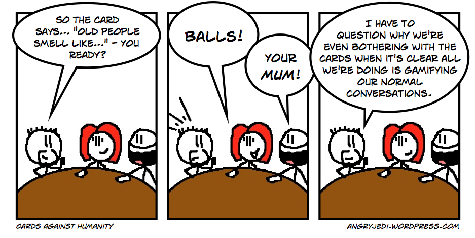 Cards Against Humanity is a great party game, then, that deserves to sit alongside titles like Balderdash and Eat Poop, You Cat! as a Fun Thing To Do After (or perhaps Before, depending on how late your host cooks) Dinner. I recommend getting some friends together and giving it a shot yourself as soon as possible, as there was plenty of mirth and merriment tonight, to the extent that one participant (whose blushes I shall spare) laughed so hard their drink came out of their nose.