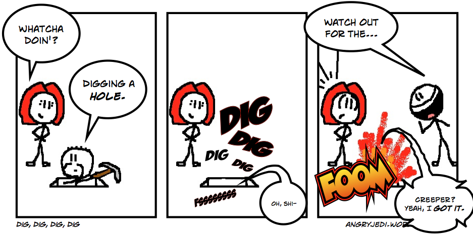 Minecraft is what you make of it. I currently play on two multiplayer servers — one with a small group of "real-life" friends and the other with a group of people I primarily know online — the aforementioned Squadron of Shame. The differing approaches we take on each server are very interesting, and represent two very different social dynamics.