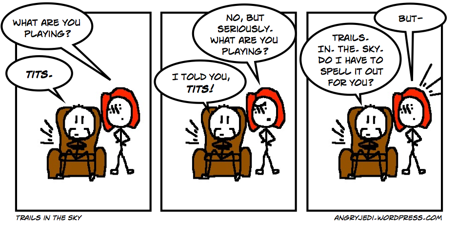 My current gaming "jam", as I believe the kids are saying nowadays, is Legend of Heroes: Trails in the Sky, just Trails in the Sky or its immensely entertaining acronym TitS for short. It's a Vita-compatible PSP game from Falcom, published by Xseed in the States and Ghostlight in the UK, and it was originally available for Windows PCs in Japan, though in the West I believe we've only seen the PSP release.