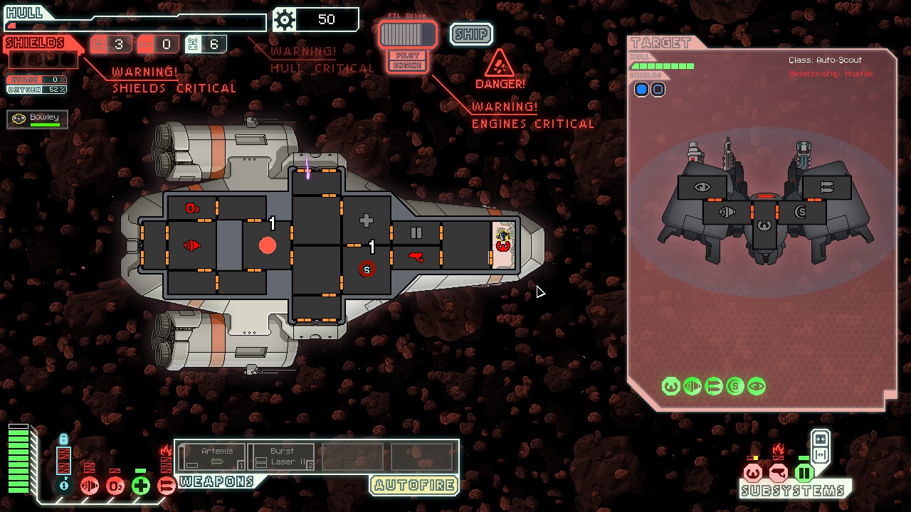The most apt descriptions of FTL would draw comparisons to the board games Space Alert and Battlestar Galactica. Like those games, FTL gives its players a small number of crew members and a sprawling ship in which to deploy them, then continually bombards them with increasingly-unreasonable challenges until they explode, die, asphyxiate or reach one of a variety of other sticky ends. It is possible to "finish" the game by beating a final boss, but for your first few playthroughs at the very least, you'll be dead within half an hour.