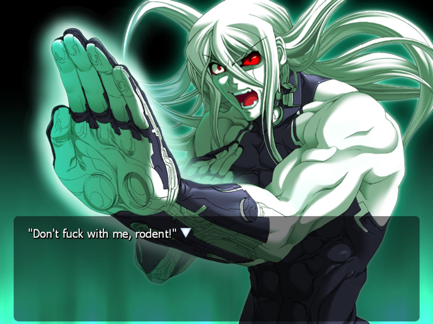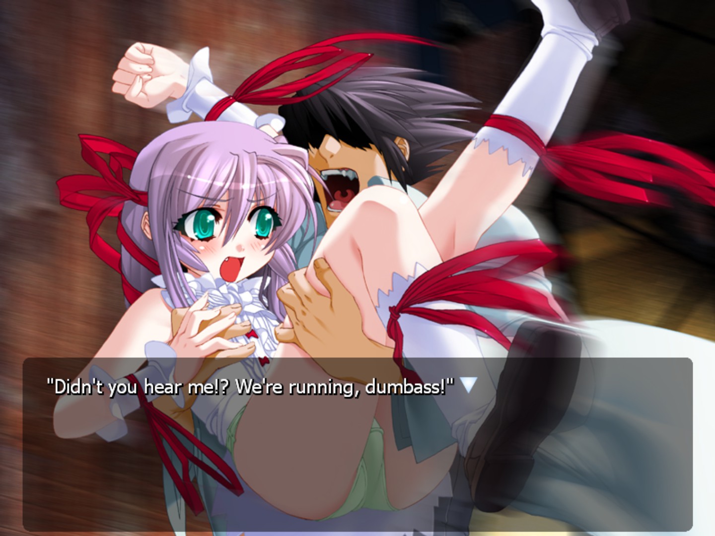 Since Demonbane isn't your usual eroge, it does things a little differently in a number of ways. One of the most notable factors in this is the matter of the protagonist Daijuuji Kurou. In many eroges — particularly the "here are some girls, date one of them" variety — the protagonist is kept as a mostly "blank slate" for the player to superimpose their own ego atop. More often than not, the protagonist's dialogue isn't voiced, even when the entire rest of the game features speech, and in "event" scenes it's rare to see the protagonist's face — it's usually hidden in shadow, behind a mop of hair or simply off-camera. There are exceptions to varying degrees, of course — in both School Days HQ and Katawa Shoujo, for example, the protagonist is a discrete character in their own right, and in My Girlfriend is the President player character Jun has a clearly-defined personality but not a voice or face in most scenes. In the case of Kurou, however, he has a personality, a voice (in the parts of Demonbane that are voiced, that is) and a face, and is absolutely a distinct character rather than a cipher for the player. And the story of Demonbane is as much the story of his journey to become a better person as it is of Good Against Evil.