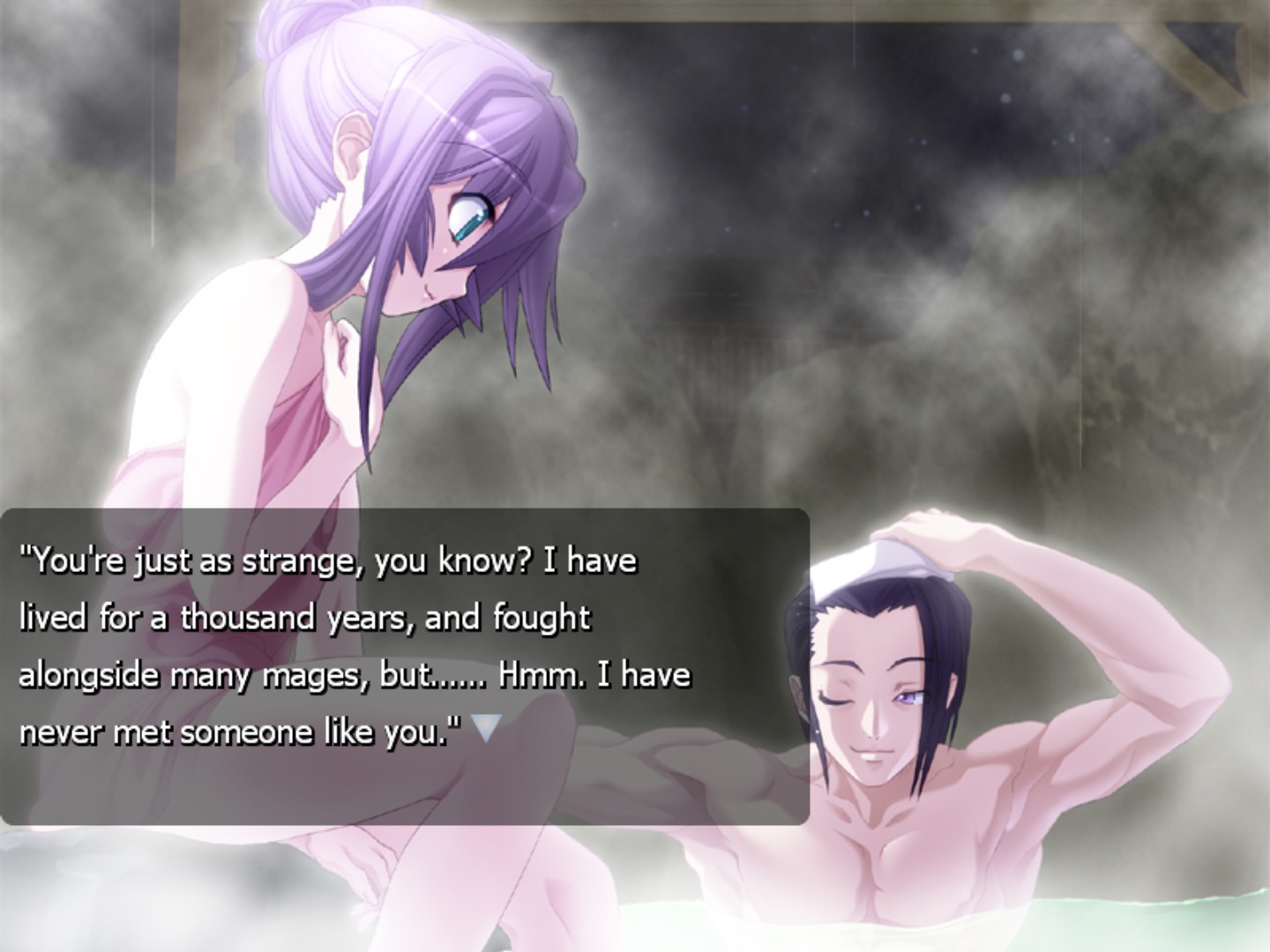 There's no set rule saying how long or short any game should be, of course, but 20 hours is a long time to just sit and read and occasionally choose between two options. It's long for a VN, I'm saying, but there's no reason why this should be an issue — after all, aren't there books of vastly different lengths? In Demonbane's case, the plot is kept nice and pacy through a chapter-based structure, and it gradually accelerates and expands in scope as the story progresses, so even though it takes a long time to get to the end of, it doesn't feel like a chore.