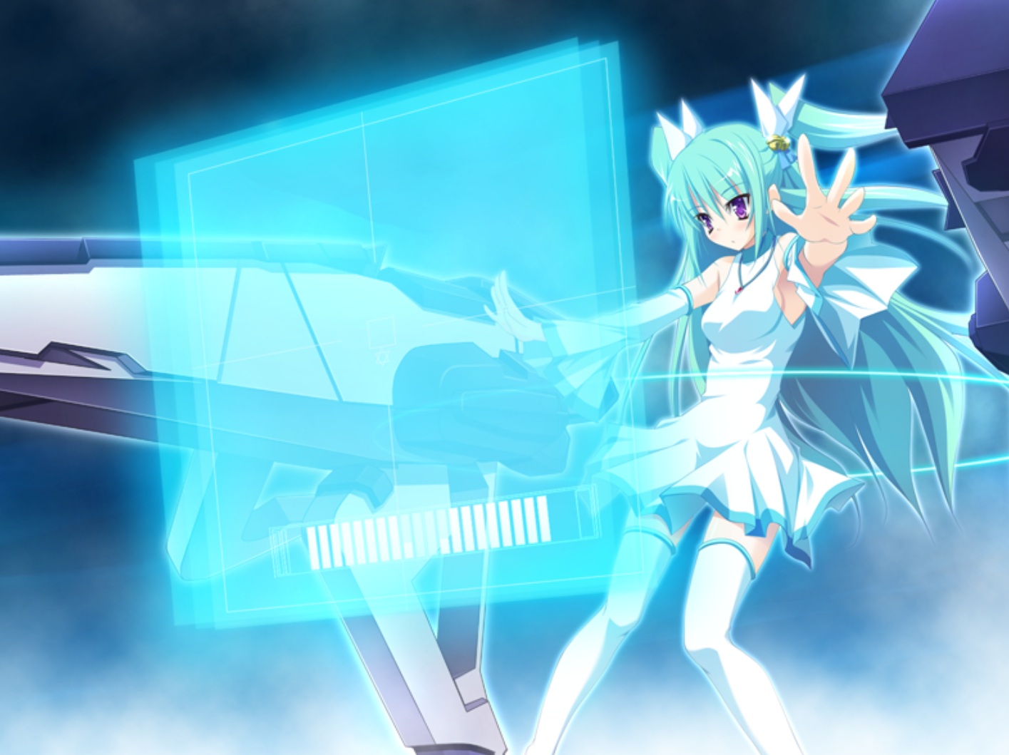 The startlingly gooey reaction that she elicited in me (and, I'm hoping, everyone else who plays My Girlfriend is the President) is due to a combination of factors. Firstly, her striking appearance — lots of green hair, twintails, huge purple puppy-dog eyes, a delicate figure. Secondly, her manner of speaking (and, by extension, her voice acting) — quiet, calm, mellow and restrained for the most part but prone to sudden outbursts of emotion. Thirdly, her personality — innocent, pure and curious at the outset, and gradually developing and evolving over the course of the story. By the end, she's much more experienced in the ways of the world in many different ways — she's much more comfortable expressing emotions, understands what "love" feels like and has a strong sense of determination to follow her own desires rather than blindly following orders. And yet at the same time, she maintains that feeling of delicateness and purity even as we start to see other, more "human" sides of her — including, of course, a filthy dirty naughty side. This is a marked contrast from what we see of her in all the other routes, where she is much more robotic and artificial-seeming — and often an inconvenience to Jun and whoever he is pursuing at the time.