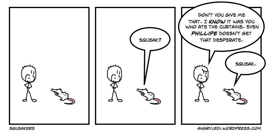 The thing that surprised me about owning rats is how much personality the pair of them have. I've never owned small furry creatures before, so I didn't know much about them. (My family had cats when I was younger, and my brother has dogs and cats, but no small furry things.) But the pair of them do obviously have different attitudes and responses to things. I'm not sure how much of this is me projecting human characteristics onto them, but it certainly looks that way, anyhow. As I said above, Lara is adventurous, curious, mostly gentle, protective of Lucy and absolutely loves coming out of the cage to explore all the nooks and crannies of the room. Lucy, meanwhile, is cheeky — there's no other word for it, really. She regularly sneaks up on Lara and tries to bite her playfully, and you can see Lara just gritting her teeth and putting up with it most times it happens, though occasionally she'll give Lucy a slap on the nose. As Lucy has grown, she has become more confident, and will hold her own in the play-fights the two of them have now rather than losing every time. She's also just started coming out of the cage to explore, though not quite as far afield as Lara just yet, and she's much more talkative than Lara, who stays quiet most of the time. Lucy, meanwhile, is always squeaking (I never knew before owning rats that they squeaked like mice!) and makes a hell of a noise when the two of them are play-fighting, which made us worry a bit the first few times they did it.