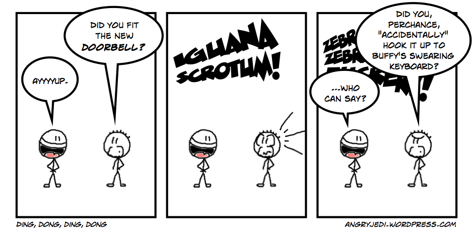 I express mock outrage at this but I guess it's sort of amusing. You could, with that doorbell, essentially have anything as your chime. If you wanted Brian Blessed shouting "GIMME THAT FUCKING BADGE BACK!" (possibly the best video on all of YouTube, that) every time someone was at the door, you could. Or perhaps the chiptune ALF theme from the dancing chicken man video I used to love so much. (Used to? I just put it on and fell in love all over again. CAN'T STOP WATCHING) Or, if you really wanted to drive yourself absolutely insane, this. Or this. Or perhaps the song that gave us Epic Sax Man. Or… well, yeah. You get the idea.