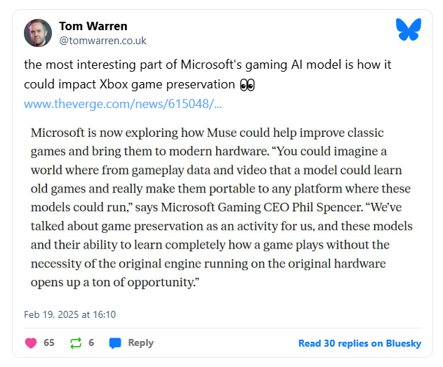 Today, a story went round about a research project at Microsoft where they were using generative AI for "game ideation", and also noted that they thought they could use their generative AI models for "preservation". This was reported on by Tom Warren, senior editor at The Verge, thus (screenshotted rather than embedded 'cause the coward deleted it after everyone dunked on it):