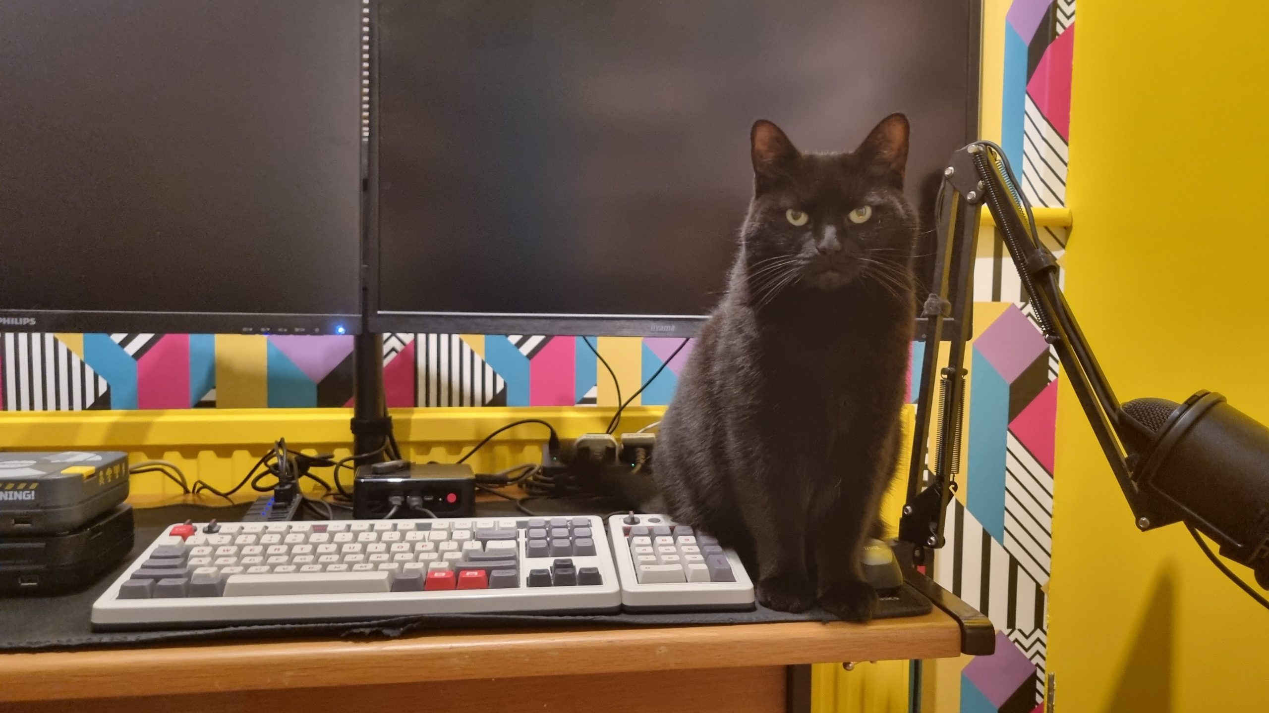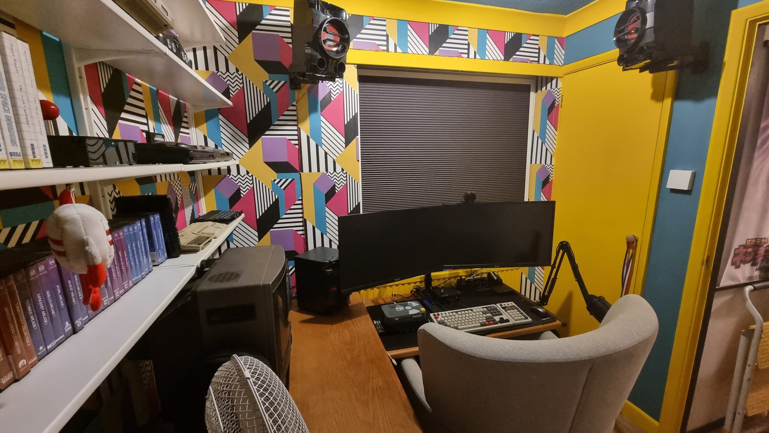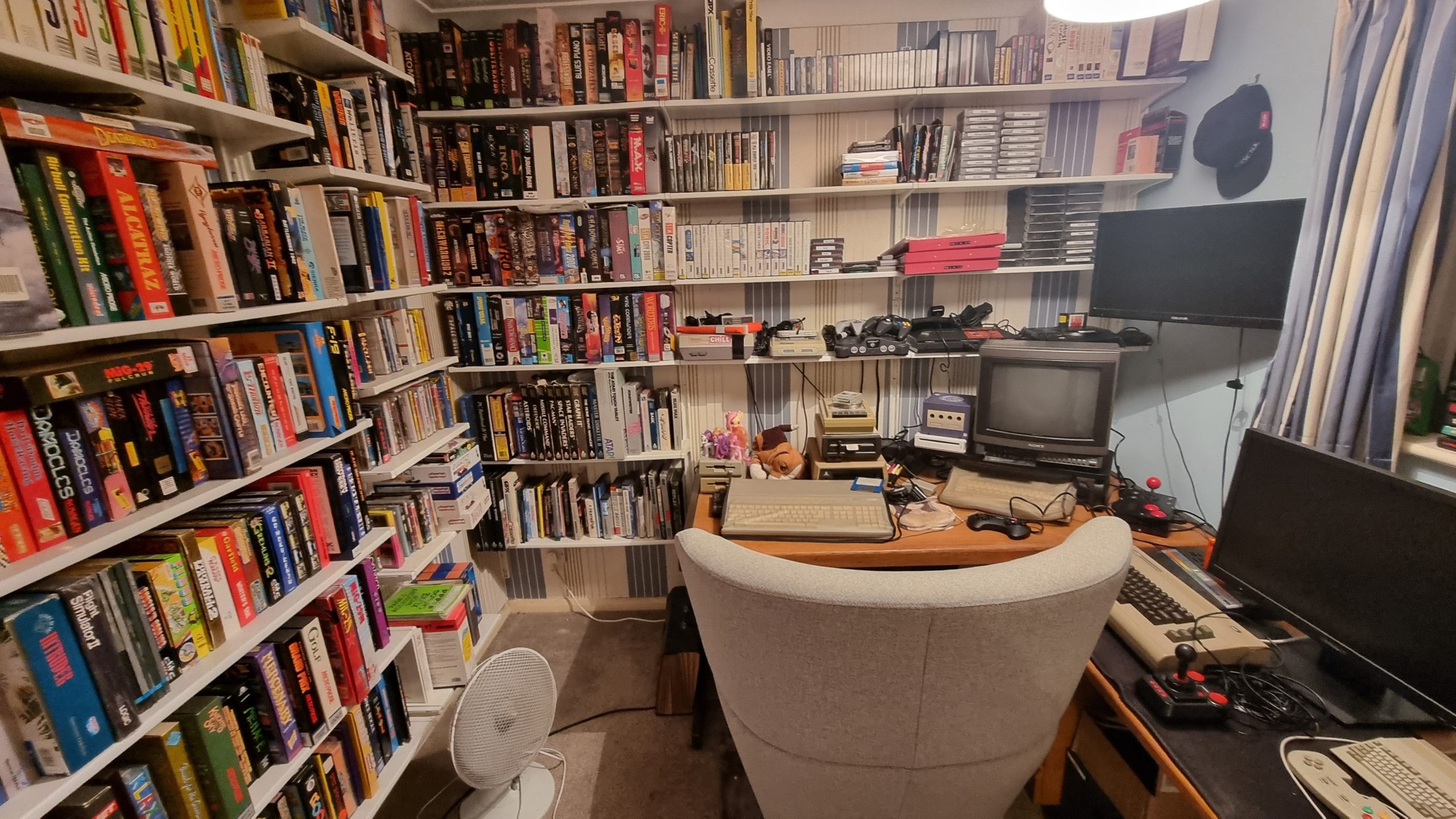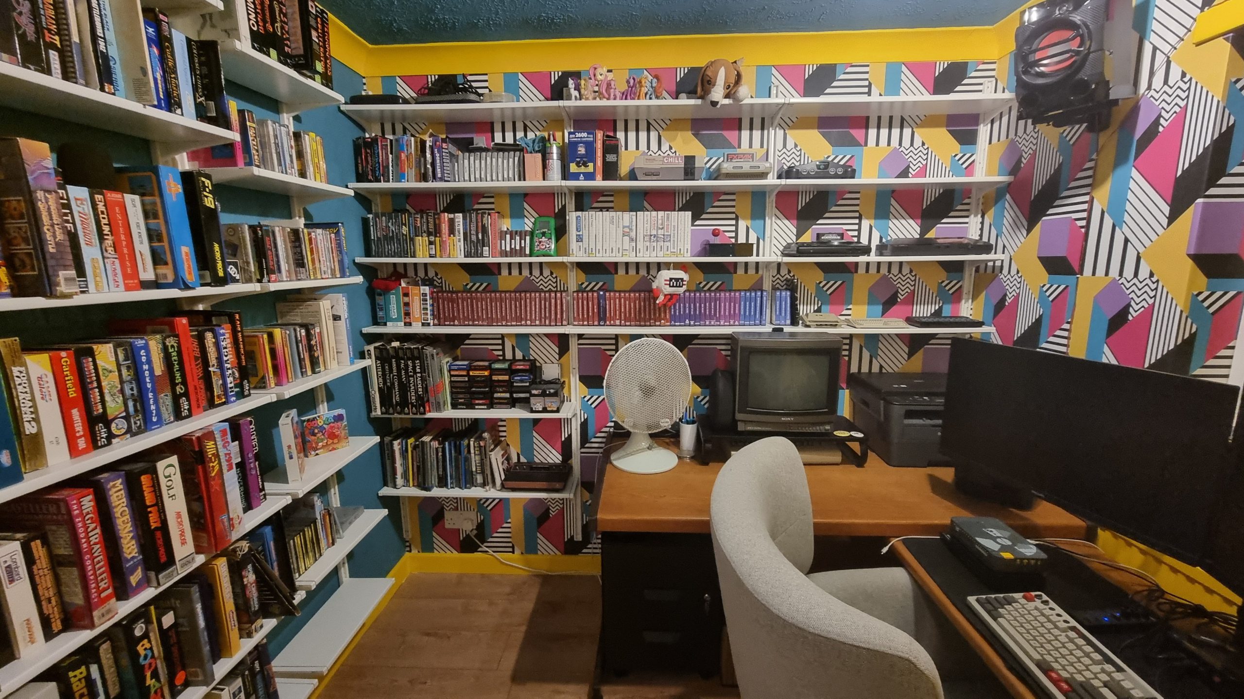Over on the desk on the right, I also upgraded to a two-monitor setup to use with the mini PC I bought a while back, so I could make the room dual purpose: retro gaming space and home office. Aside from those changes, this is pretty much the state of the room before. Note the grotty horrible carpet that came with the house and the unnecessary wall-mounted TV. (We put that in with the intention of using it for Chromecasting YouTube videos and suchlike, but I never used it, so my wife has reclaimed it to put in her shed.)