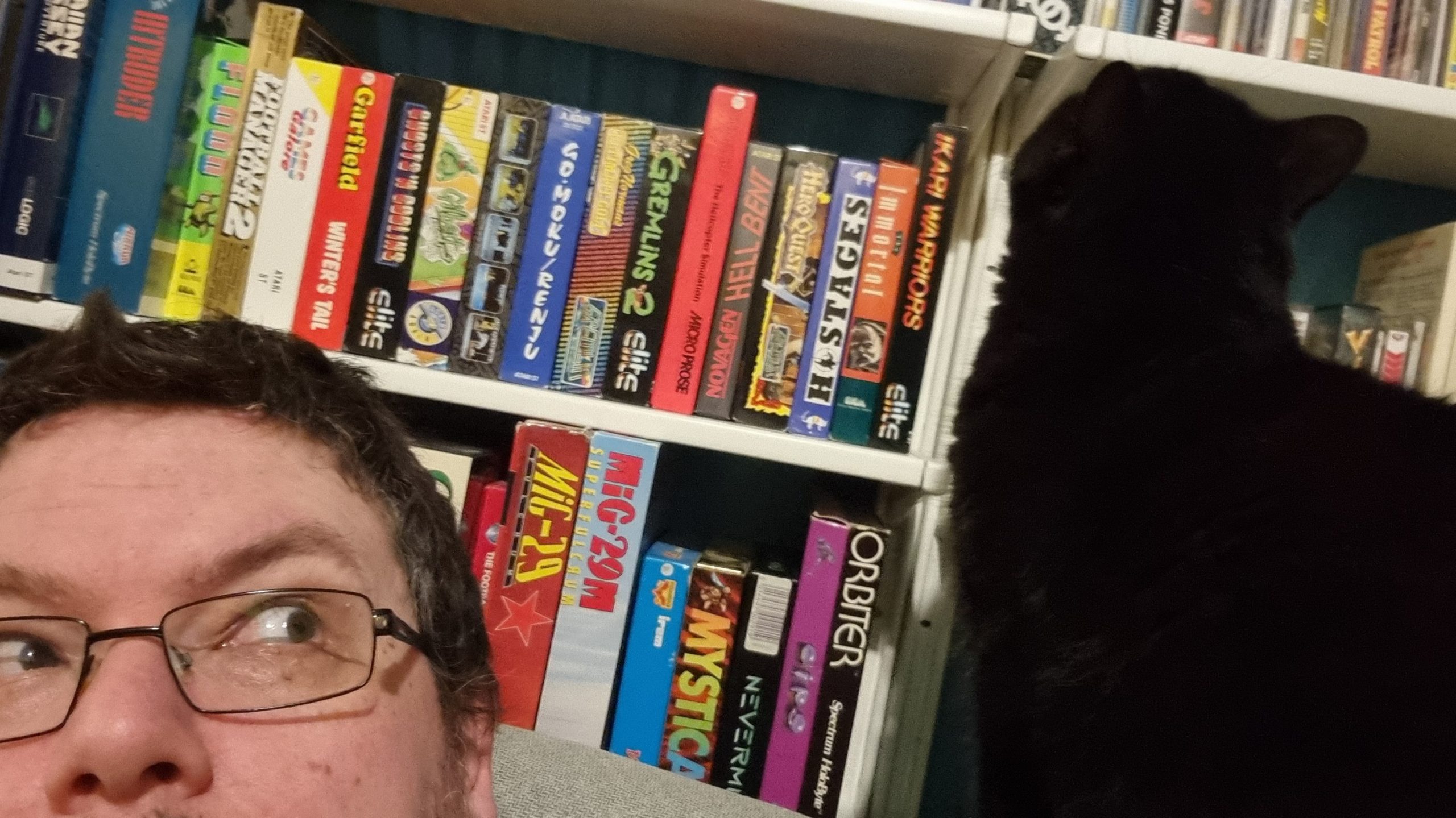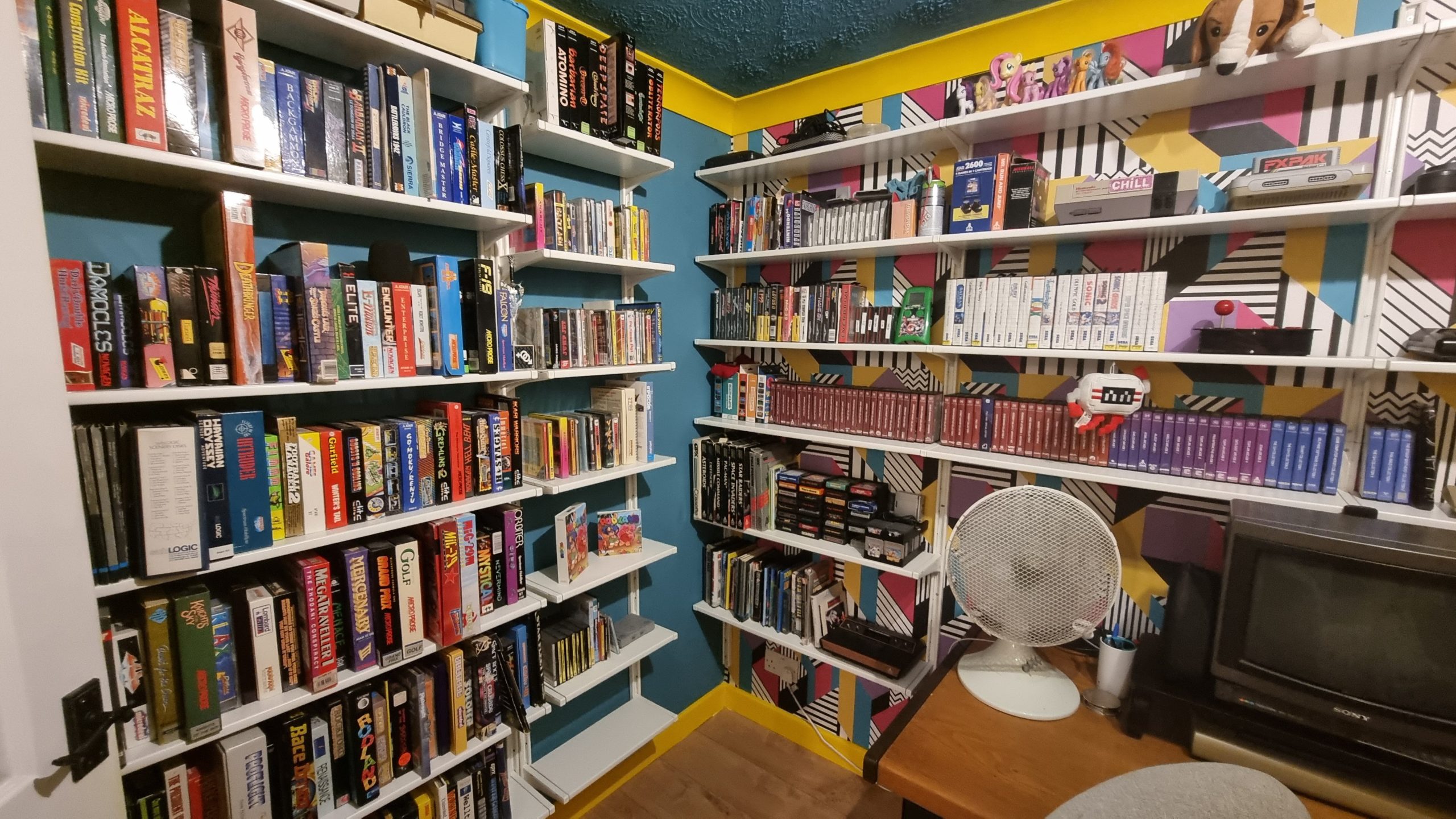 The whole thing was getting a bit cluttered, so we had a bit of a clear-out a while back. With a heavy heart, I packed away the "real hardware" Atari computers, since the vast majority of stuff I do with them for video is via emulation anyway, and those went in the loft. A bunch of the software that didn't really need to be on display — mostly stuff like productivity software for the Atari ST, and big box PC games I didn't have a means of installing (and which, in most cases, I had digital copies of anyway) — also went in the loft.
