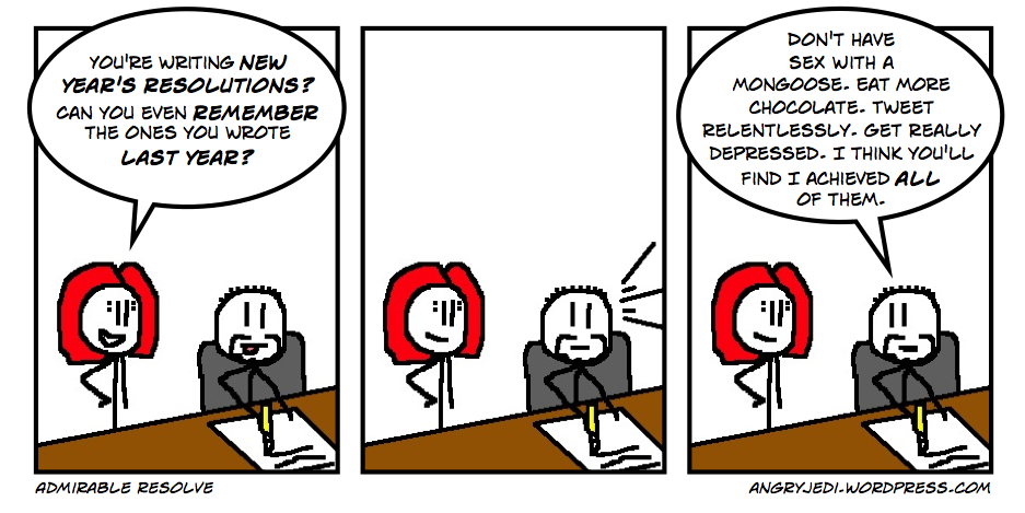 - I will actually finish writing the story I've had stuck in my head for the last ten years and which has gone through more rewrites than an aborted metaphor involving something that gets rewritten a lot. (12,000 words so far. On the story, not the metaphor. That would be a metaphor of Dickensian proportions.)