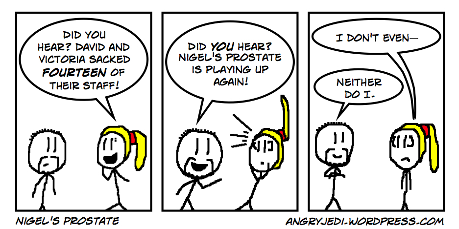 Front page of ever-reliable rag The Sun today bore a story about David and Victoria Beckham sacking fourteen members of their staff. That's a whole third of their staff! Disasteriffic! How terrible! How awful! How nightmarish! It must be so tough for them!