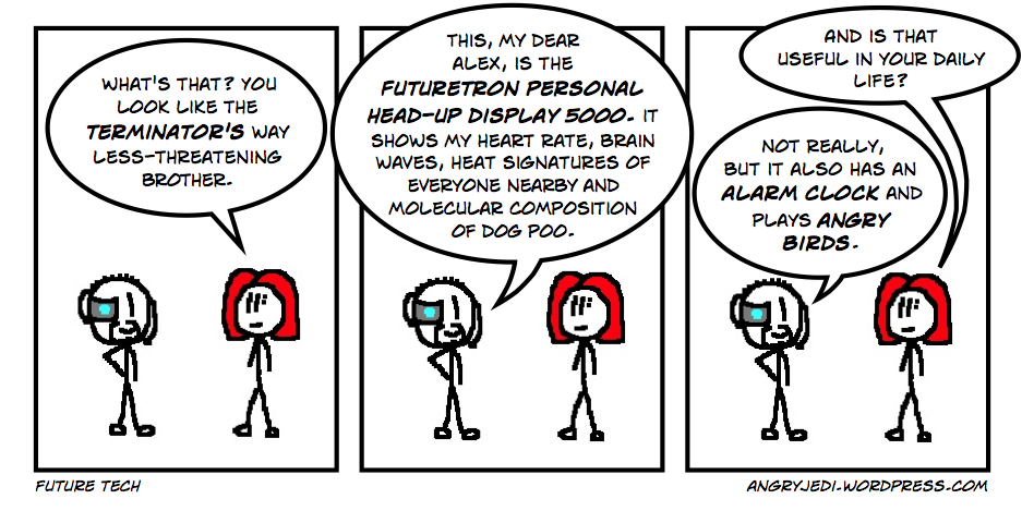 In actuality, what we're more likely to get, should we ever end up with head-mounted displays or computers in our brains, is something akin to a first-person shooter's head-up display. Perhaps with the capability to install apps. So while you're sitting in a boring meeting and not paying attention, you can be playing Snake instead. And no-one will be any the wiser, except when they see your eyes darting around to find the next apple. And when curious sound effects start emanating from your nostrils.