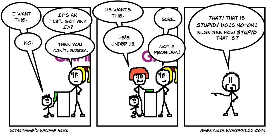 Little Johnny wants to buy a copy of acclaimed and excessively popular (some might say cultish) Lovecraftian multiplayer FPS Call of Cthuty: Black Arts and heads down to his local GAME. There, he attempts to procure a copy of said game—which has a big shiny red BBFC "18" certificate on it—with the pocket money he's saved up. Little Johnny is eleven years old and doesn't have any ID, fake or otherwise. The cashier at GAME refuses to serve him. Little Johnny goes home and cries, and Xbox LIVE is safe from another squeaky-voiced pipsqueak for another day.