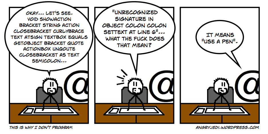 I've mentioned a number of times on this 'ere blog that I don't really have the knack of programming. I can sort of do it if I have plenty of reference material to hand or if I'm following a tutorial, but it's the sort of thing that if I don't do it regularly, it just all falls out of my head and makes a mess on the carpet.