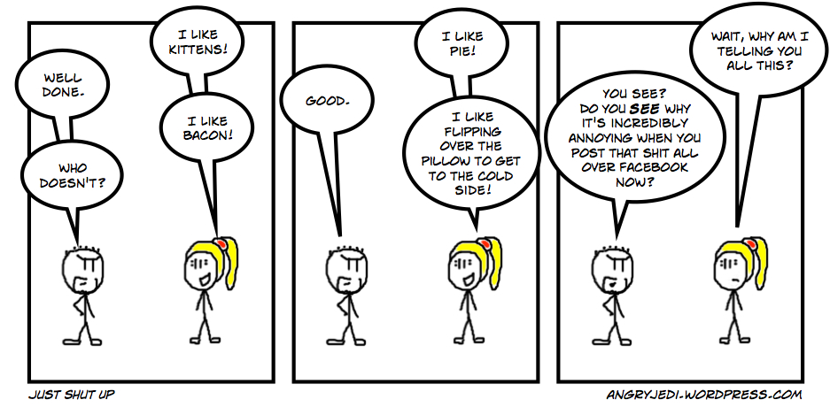 This isn't the case universally, obviously. There are still some actual conversations that go on on Facebook, for example, but these can easily be lost in the torrent of people resharing crap from pages like "I fucking love science" (do you? Then go do some rather than recycling endless fucking memes) and "LIKE AND SHARE!!" (NO!!). Twitter is a reasonable platform for discussion at times, but conversations are easily derailed and, as has been proven hundreds of times in the past year alone, 140 characters is really not enough to make a coherent argument about a complex issue. It's also incredibly easy to be taken out of context on Twitter.