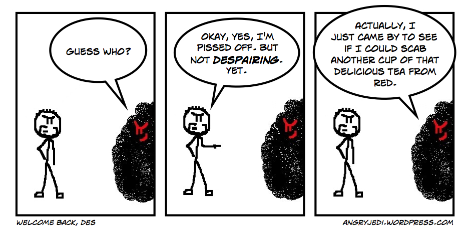 Nearly everyone I've spoken to has had an absolutely terrible day today. If you are one of those people who has had a terrible day, I offer my sympathies, condolences, fistbumps, high fives, whattups, hugs, manly nipple tweaks or cock-punches (take your pick) and understand entirely if you're currently feeling a bit less-than-optimum.
