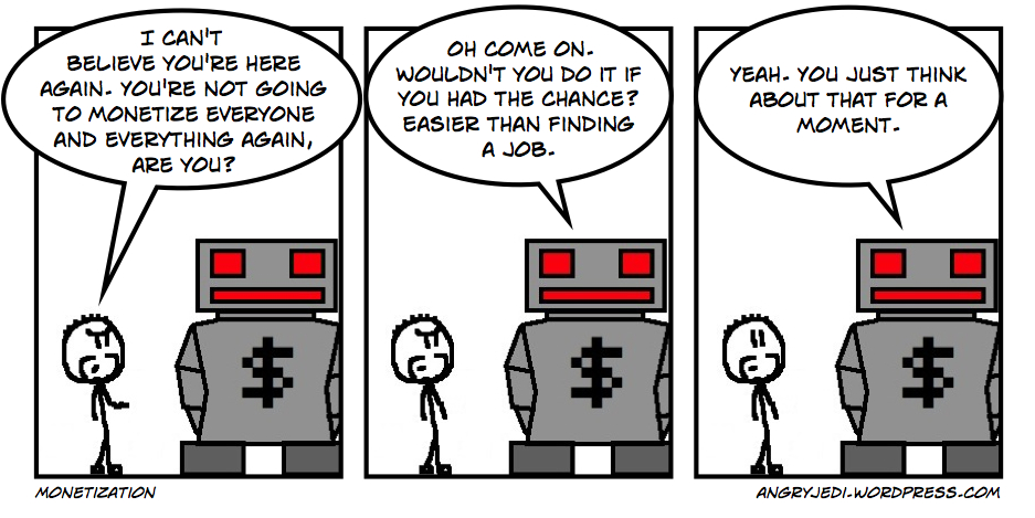 I came to a realisation today. I have a thing about the word "monetize" (or, arguably, "monetise" if you want to be English about it, although the latter is not recognised by a British English spellchecker). This is not news to those of you who have been following this blog for some time. Some of you may even recall the Money Robot, star of