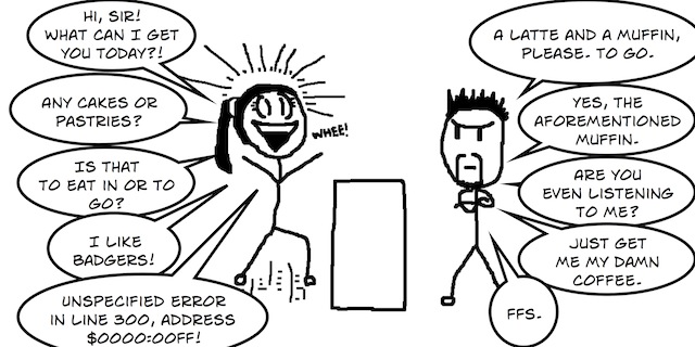 My point is, though, all of these incidents could have been easily avoided by the above people acting like actual human beings rather than robots. It's unnecessary to have a script to ask people whether they want a cake with their coffee. I have never heard anyone reconsider whether they want a "cake or pastry" after being asked that question. If someone wants a cake (or pastry), they'll generally ask for it. If they have already asked for it, you don't really need to ask it again.