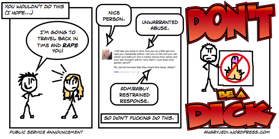 And the best answer I can come up with is "because they had nothing better to do." My attacker is, according to his Twitter profile, a member of an anti-blogger group with a spectacularly offensive name whom I'd never heard of prior to today, and it seems they have something of a habit of attacking people in this manner for reasons best known unto themselves. It seems that today, I was just unlucky enough to be the one in the firing line. I'm now not all that worried about this ridiculous turn of events, because frankly I don't really see the "authorities" — if they were contacted at all, which I seriously doubt — trusting the word of someone who voluntarily chooses to associate themselves with a group called… well, this. (Wikipedia link, offensive name. You have been warned.)