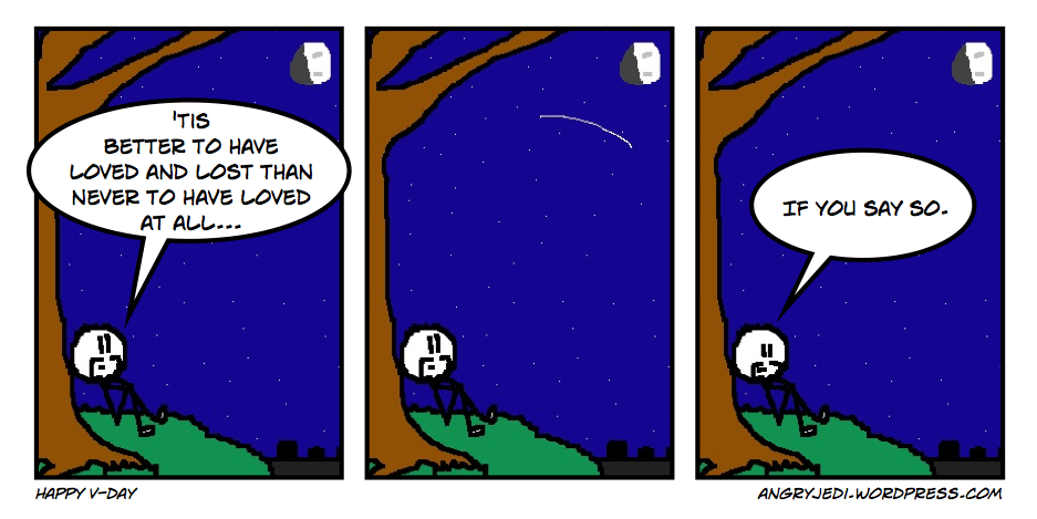 I'm not bemoaning the fact I'm single on Valentine's Day. This is nothing unusual—I spent the vast majority of my formative V-days single, so much so that it's easy to ignore that particular fact right now, were it not for the fact that this day (and the ones immediately following it) hold rather more personal significance for me than just reminding me that last year I wasn't single.